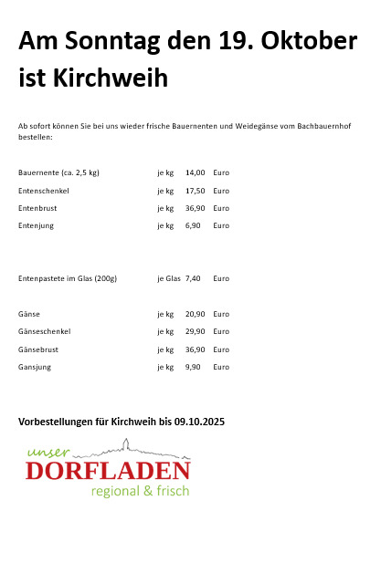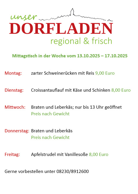 Mittagstisch vom 13.10.-17.10.202513. Oktober 2025 Bestellen Sie gerne vor: 08230/8912600 kontakt@luetzelburgerdorfladen.de Neues aus unserem Dorfladen17. September 2025 Vorbestellungen für Kirchweih am 19.10.25