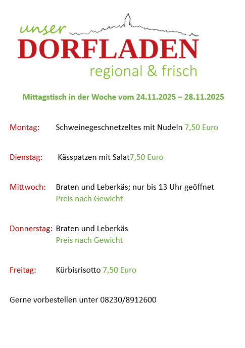 Vor dem Dorfladen werden schöne Adventskränze und adventliche Dekoration verkauft. Der Dorfladen bietet Punsch, Glühwein, Weisswürste, Wiener und Leberkässemmeln an.