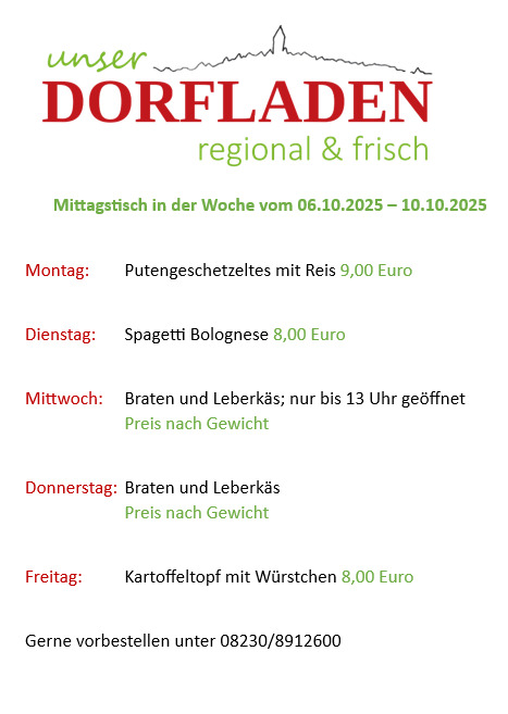 Mittagstisch vom 06.10.-10.10.2025 Posted on 6. Oktober 20256. Oktober 2025 by Dorfladenteam Bestellen Sie gerne vor: 08230/8912600 kontakt@luetzelburgerdorfladen.de