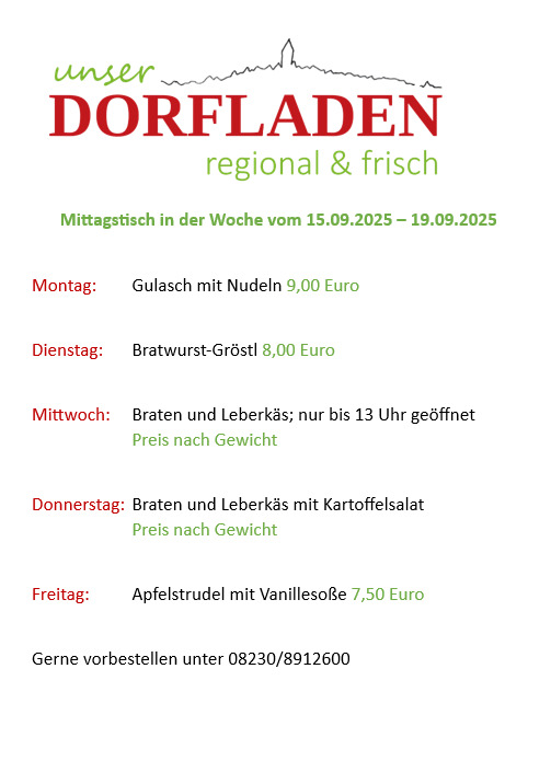 Mittagstisch vom 15.09.-19.09.2025 Posted on 15. September 202515. September 2025 by Dorfladenteam Bestellen Sie gerne vor: 08230/8912600 kontakt@luetzelburgerdorfladen.de