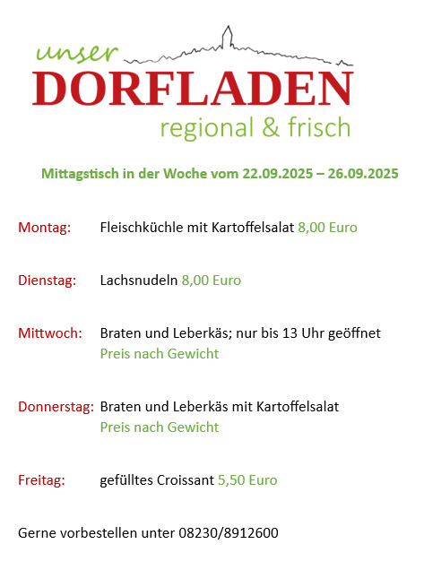 Mittagstisch vom 22.09.-26.09.2025 Posted on 22. September 202522. September 2025 by Dorfladenteam Bestellen Sie gerne vor: 08230/8912600 kontakt@luetzelburgerdorfladen.de