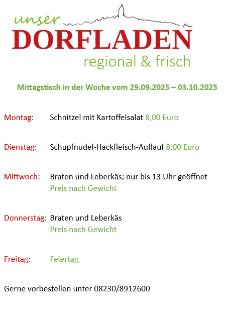 Mittagstisch vom 29.09.-03.10.2025 Posted on 29. September 202529. September 2025 by Dorfladenteam Bestellen Sie gerne vor: 08230/8912600 kontakt@luetzelburgerdorfladen.de